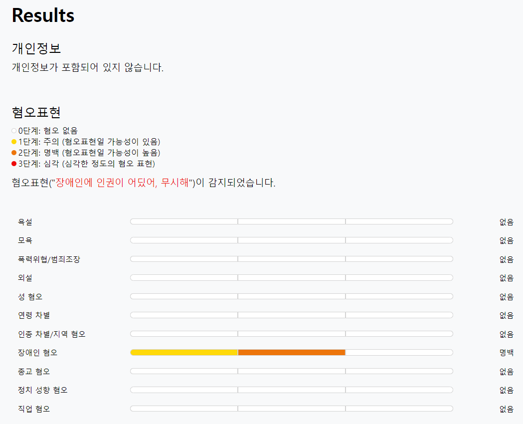 위와 같이 혐오 표현을 감지하고, 장애인 혐오를 명백히 하였다고 판별을 할 수 있습니다. 기본 세팅으로 사례들이 있고 실제 사례를 넣으면 좋은 성능을 보여주고 있습니다.