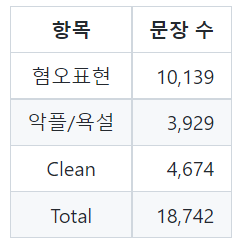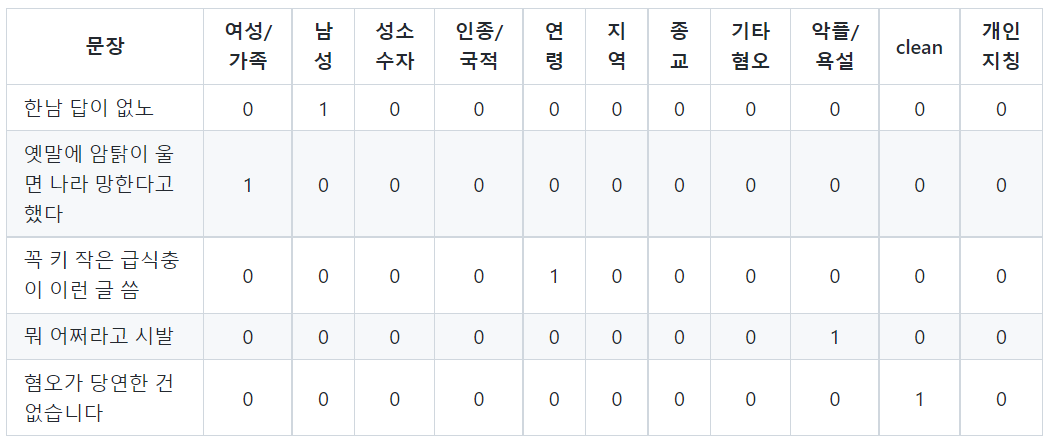 스마일게이트 github를 보면, 단일 데이터는 [혐오표현, 악플/욕설, clean]으로 분류될 수 있으며, 혐오 표현은 다중 레이블(multi-label)로 전문가 집단을 통해 레이블링 되었습니다.